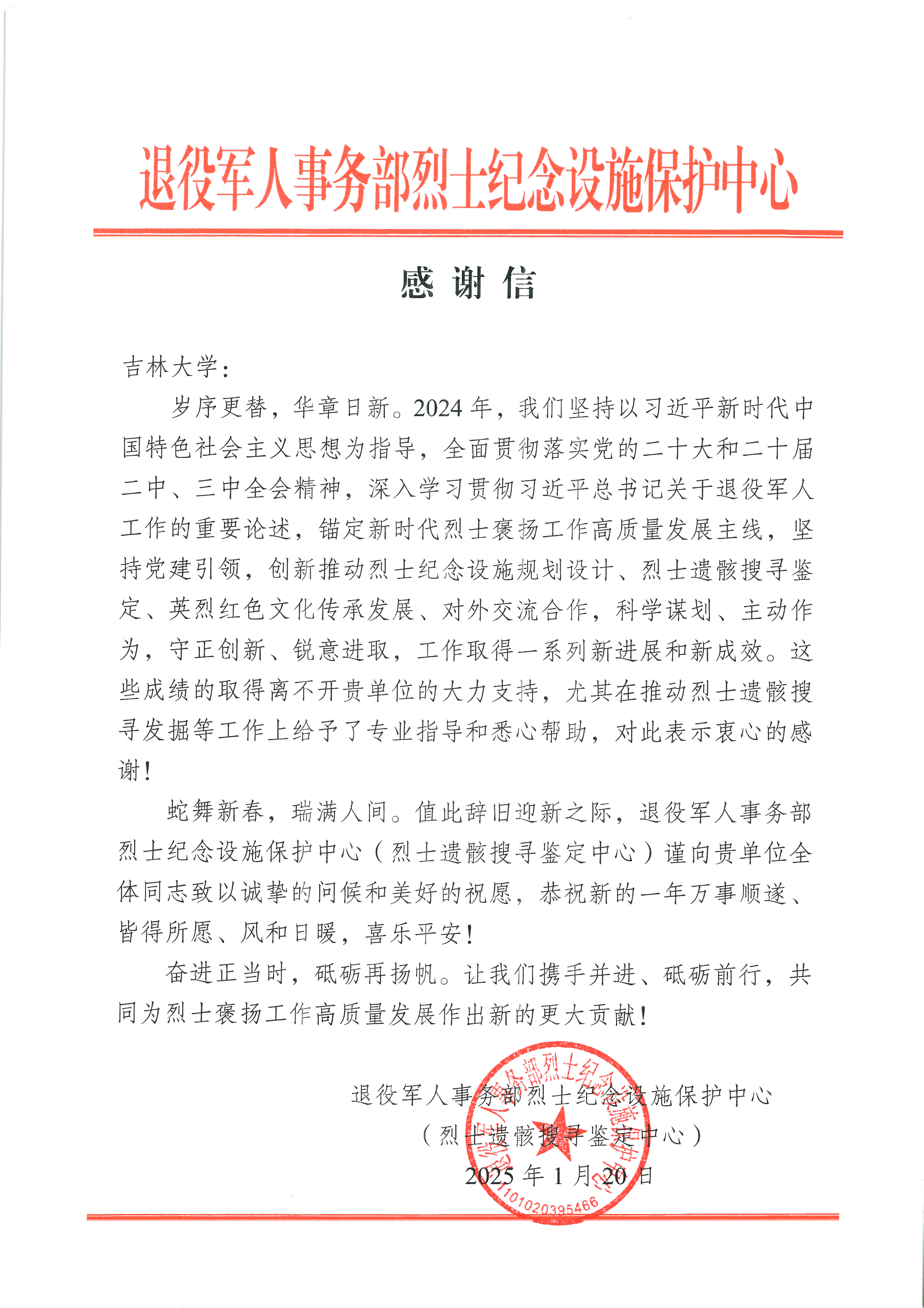 感谢信结尾向吉林大学致以新春祝福,并期待双方继续携手推进烈士褒扬工作。作为主要技术执行单位,实验室将继续在学校领导下,为守护英烈历史贡献专业力量。